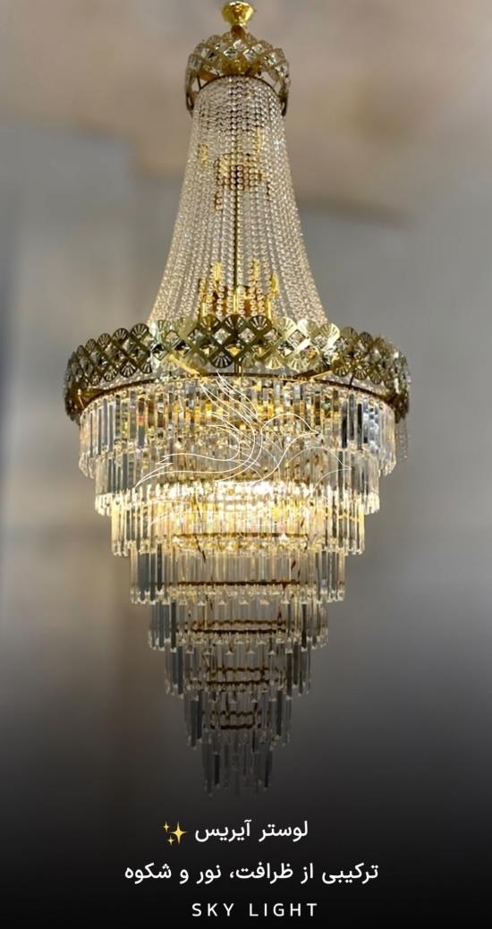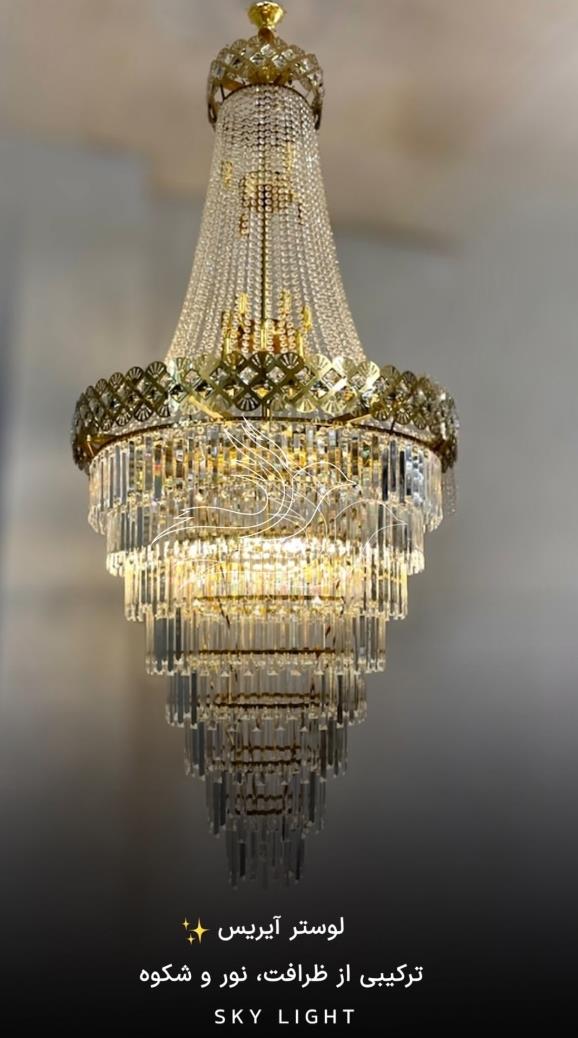 لوستر آیریس انتخابی باشکوه برای فضاهای بلند و مجلل است. طراحی کشیده و چشمنواز آن، همراه با کریستالهای درخشان تمامقد، جلوهای خیرهکننده به سقفهای بلند میبخشد.