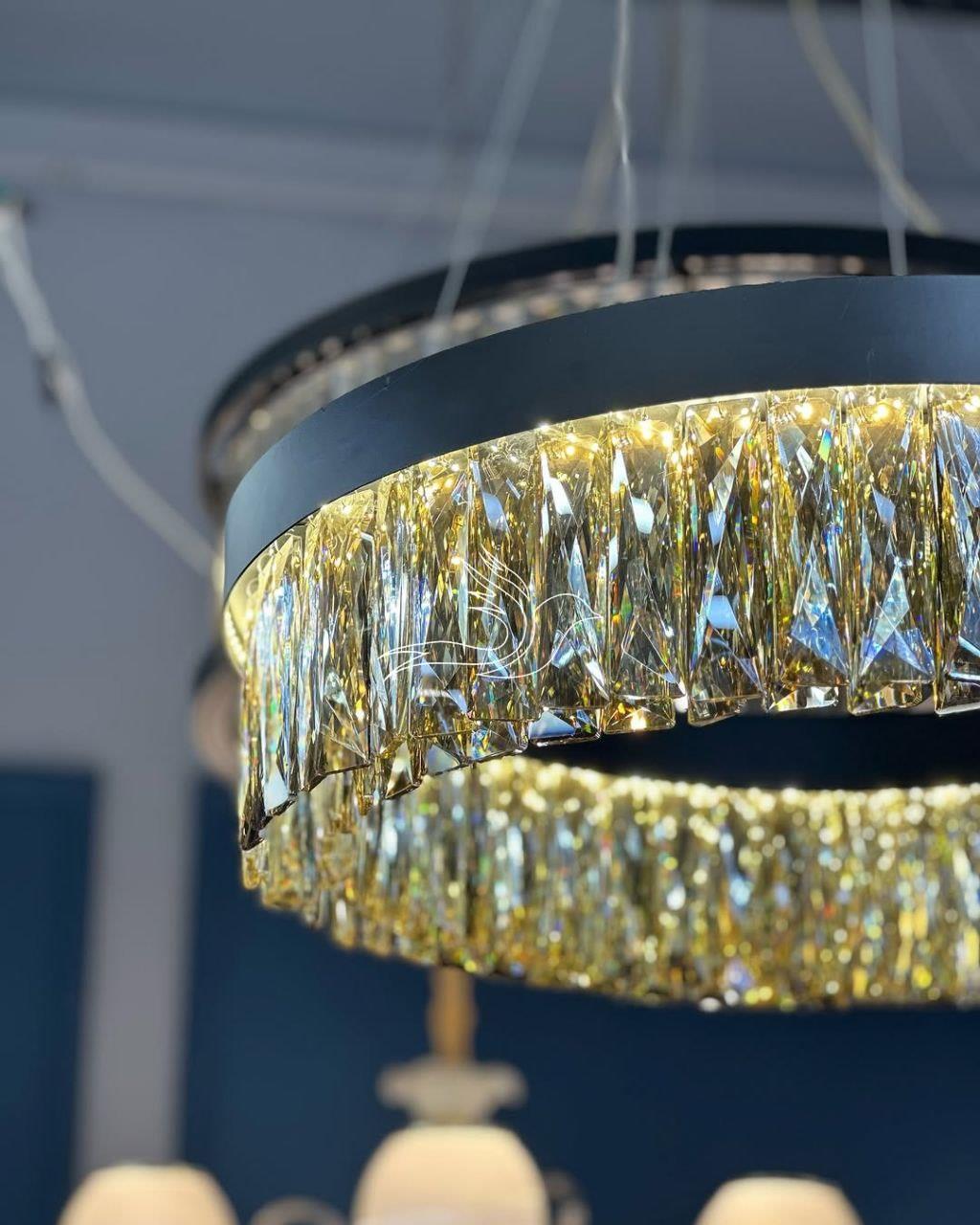 دارای کریستالهای درخشان است که نور را به زیباترین شکل بازتاب میدهد. بدنه فلزی با رنک بندی مشکی استاتیک ، آبکاری براق و کریستالهای تراشدار، جلوهای لوکس و چشمنواز به فضای شما میبخشد. مناسب برای سالن، پذیرایی و فضاهای مدرن.
